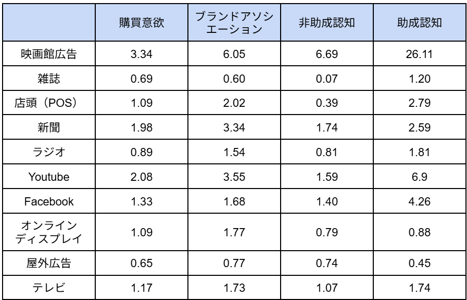 注)Bell et al. (2025) Table 5 よりチャネル部分を抜粋し、統計的な信頼性の値は省略。。数値は広告成果に与える影響力の強さを比較するための目安で、数値が大きいほど影響が強いことを示す。